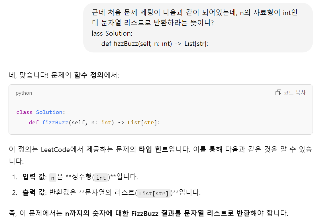 class Solution: def fizzBuzz(self, n: int) -> List[str]: result = [] for i in range(1, n+1): if i % 15 == 0: result.append("FizzBuzz") elif i % 5 == 0: result.append("Buzz") elif i % 3 == 0: result.append("Fizz") else: result.append(str(i)) # int -> str return result빈 리스트 result [] 를 만들고 for문을 돌면서 하나하나 추가해 주면 된다.