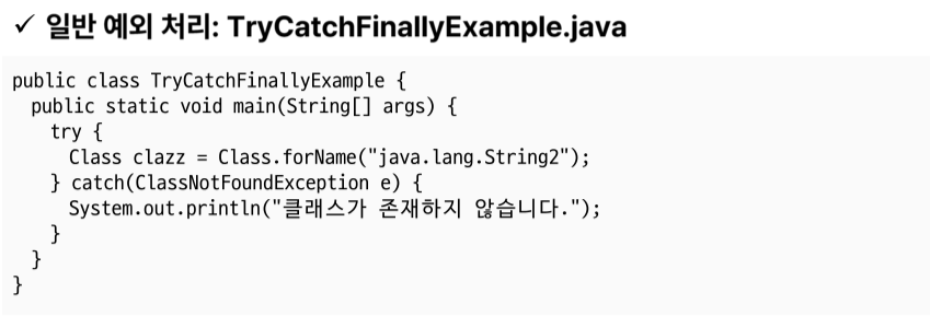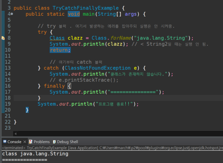 3.String이라는 클래스는 존재하므로 try 블럭을 출력.
