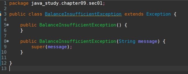 더보기package java_study.chapter09.sec01; public class Account { private long balance; public Account() { } public long getBalance() { return balance; } public void deposit(int money) { balance += money; } public void withdraw(int money) throws BalanceInsufficientException { if (balance < money) { throw new BalanceInsufficientException("잔고부족:" + (money - balance) + " 모자람"); } balance -= money; } }throw에 s가 붙은 복수형인 throws인 이유 (동사인 줄 알았는데 명사고..)