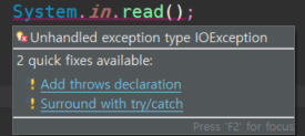 Add throws declaration 첫 번째 항목을 선택하면 자동으로 완성된다. ⬇️