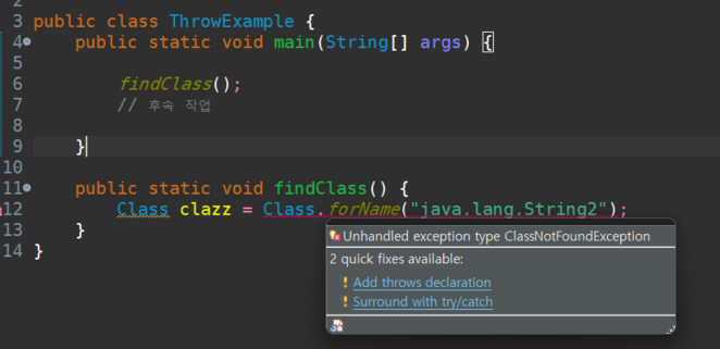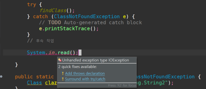 Surround with try/catch 선택 예외를 호출했던 쪽(ClassNotFoundException)으로 다시 떠 넘길 수 있다.
