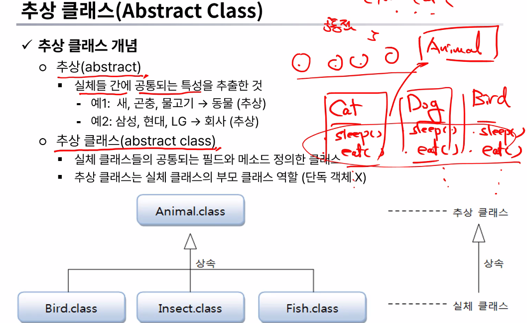 더보기public class SmartPhone extends Phone { // 생성자 public SmartPhone(String owner) { super(owner); } // 메소드 public void internetSearch() { System.out.println("인터넷 검색을 합니다."); } }public class PhoneEx { public static void main(String[] args) { // Phone phone = new Phone(); (x) SmartPhone smartPhone = new SmartPhone("홍길동"); smartPhone.turnOn();// Phone의 메서드 smartPhone.internetSearch(); smartPhone.turnOff(); // Phone의 메서드 Phone phone = new SmartPhone("홍길동"); phone.turnOn(); // Phone의 메서드 ((SmartPhone) phone).internetSearch(); phone.turnOff(); // Phone의 메서드 } }동물은 소리를 낸다. 그러나 동물의 소리란 것을 콕 집어 말할 순 없으니 자식 클래스에서 정의를 내리는데,