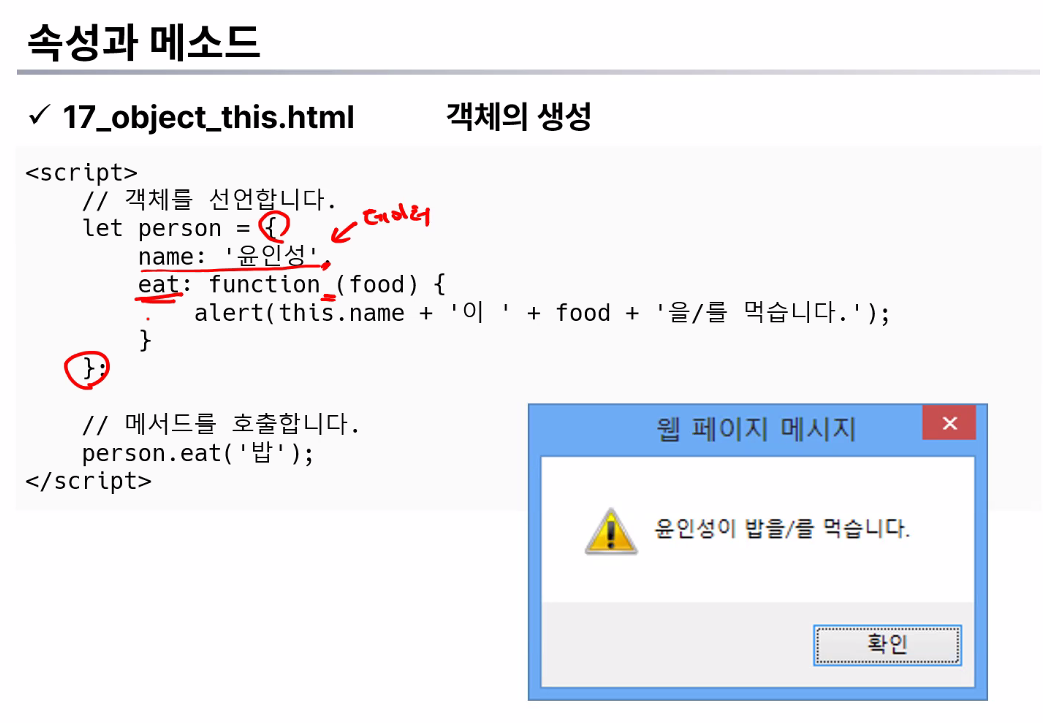 let person = { name: '윤인성', eat: function (food) { console.log(this.name + '이 ' + food + '을/를 먹습니다.'); console.log(this); }, };key : name, eat