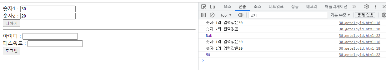 <script> function add(x, y) { alert('더하기 기능 처리'); alert('더한 값의 결과' + (x + y)); } function minus(x, y) { alert('빼기 기능 처리'); alert('뺀 값의 결과' + (x - y)); } function plus(x, y, z) { alert(x + ' ' + y + '! ' + z + '! '); } function age(x, y) { alert(x + '님의 내년 나이는' + (y + 1) + '세입니다.'); } </script> </head> <body> <button type="button" onclick="add(200, 100)">더하기</button> <button type="button" onclick="minus(400, 100)">빼기</button> <button type="button" onclick="plus('안녕', 'JSP', '바이바이')"> 문자열 더하기 </button> <button type="button" onclick="age('홍길동', 100)">나이 출력</button> <!--<input type="button" value='더하기'>--> </body>일반적인 기능이 아니라 버튼 누르면 고정된 값으로 나오긴 함.