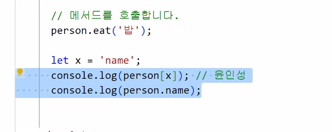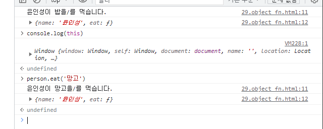 let person = {name: '윤인성',eat: function (food) {console.log(this.name + '이 ' + food + '을/를 먹습니다.');console.log(this);},};// 메서드를 호출합니다.person.eat('밥');