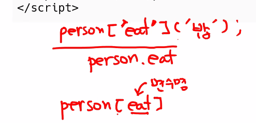 위의 두 줄과 달리 세 번째 줄과 같이 따옴표를 안 쓰면 eat이 변수명으로 되어버린다. 변수를 통해서 속성에 접근하려할 때 = 함수를 호출하려고 할 때 아래와 같이 쓴다.