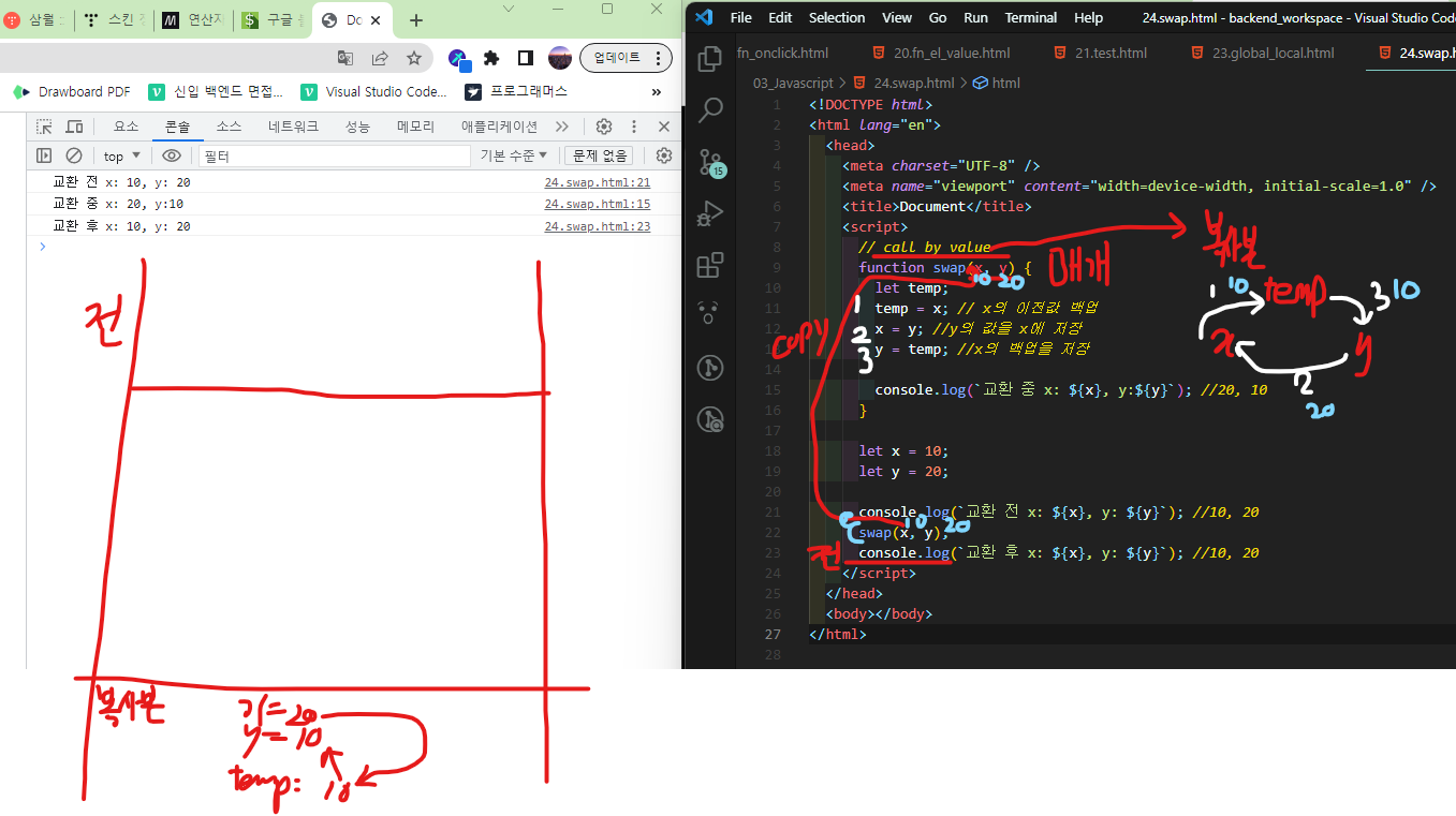 console.log(`교환 전 x: ${x}, y: ${y}`); //10, 20swap(x, y);console.log(`교환 후 x: ${x}, y: ${y}`); //10, 20