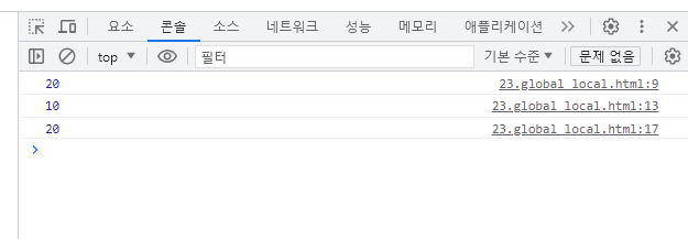 let x = 20; // 전역변수console.log(x); // 전역변수 x 출력