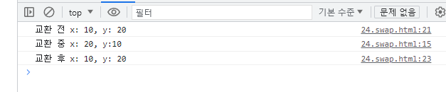 console.log(`교환 중 x: ${x}, y:${y}`); //20, 10}
