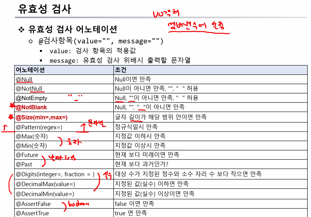 <dependency> <groupId>org.hibernate.validator</groupId> <artifactId>hibernate-validator</artifactId> <version>6.0.7.Final</version> </dependency>VO 객체에 유효성 검사를 위한 어노테이션을 사용가능하다.