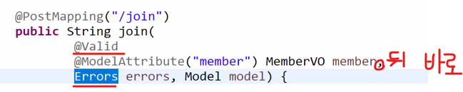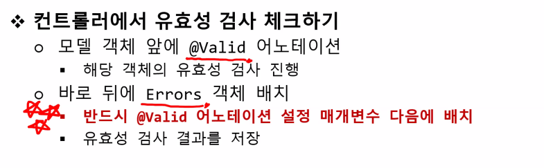 유효성 검사 체크 시 유의할 점 @Valid 뒤로 Errors 안 붙이면 안 된다. (다른 곳에 있으면 오동작한다.)