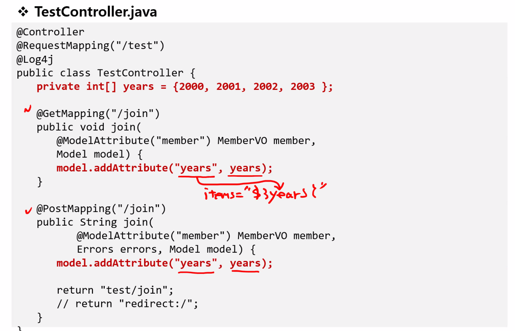 @PostMapping("/join") public String join( @Valid @ModelAttribute("member") MemberVO member, Errors errors, Model model) { log.info("POST: " + member); if(errors.hasErrors()) { return "test/join"; // forwarding --> form을 다시 입력하도록 함(이전 값으로 복사) } // DB 처리 작업 return "redirect:/"; }에러인지 확인도 해야 하므로 이 코드를 삽입