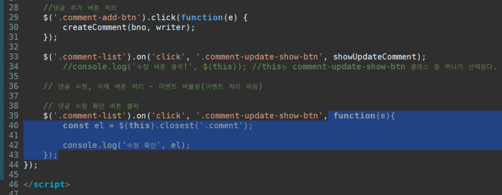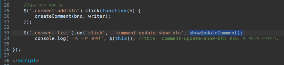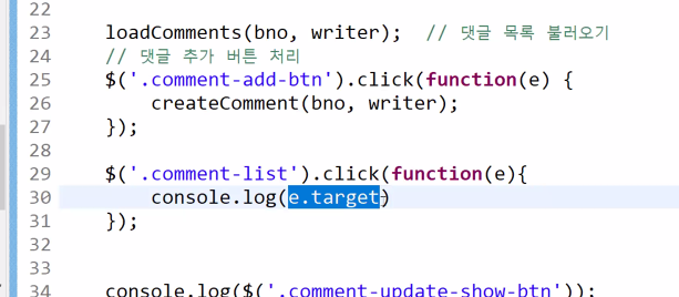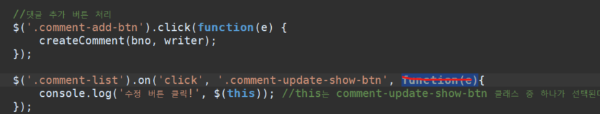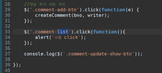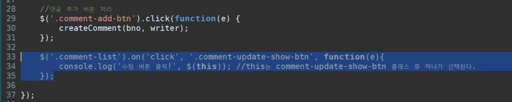//댓글 추가 버튼 처리 $('.comment-add-btn').click(function(e) { createComment(bno, writer); }); $('.comment-list').on('click', '.comment-update-show-btn', function(e){ console.log('수정 버튼 클릭!', $(this)); //this는 comment-update-show-btn 클래스 중 하나가 선택된다. }); });
