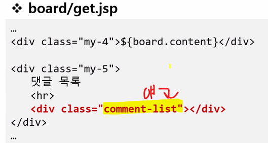 function loadComments(bno, writer) { let comments = []; // API로 불러오기 comments = rest_get(COMMENT_URL); for(let comment of comments) { const commentEl = createCommentTemplate(comment, writer); $('.comment-list').append($(commentEl)); } }여기서 >> $('.comment-list') 라인이 선택한 게 get.jsp의 comment-list