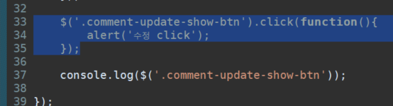 $('.comment-update-show-btn').click(function(){ alert('수정 click'); }); console.log($('.comment-update-show-btn'));