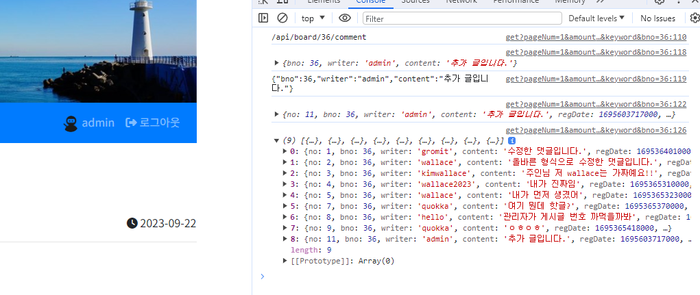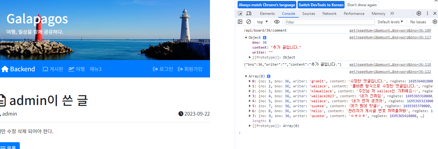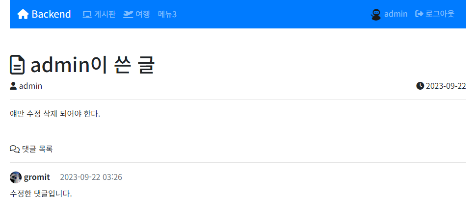 *사진상 오류는 admin 작성자인 게시글에 admin으로 댓글달려고 해서 안 됨 원래 (하드코딩이라 가능)