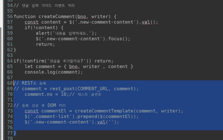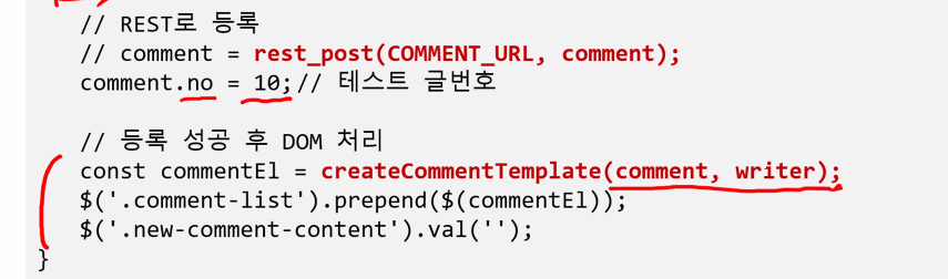 >>$('.new-comment-content').val(''); 이게 기존 입력한 거 클리어하는 역할// REST로 등록 // comment = rest_post(COMMENT_URL, comment); comment.no = 10;// 테스트 글번호 // 등록 성공 후 DOM 처리 const commentEl = createCommentTemplate(comment, writer); $('.comment-list').prepend($(commentEl)); $('.new-comment-content').val(''); }