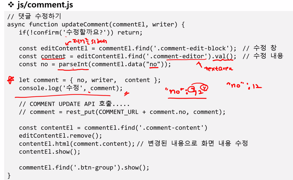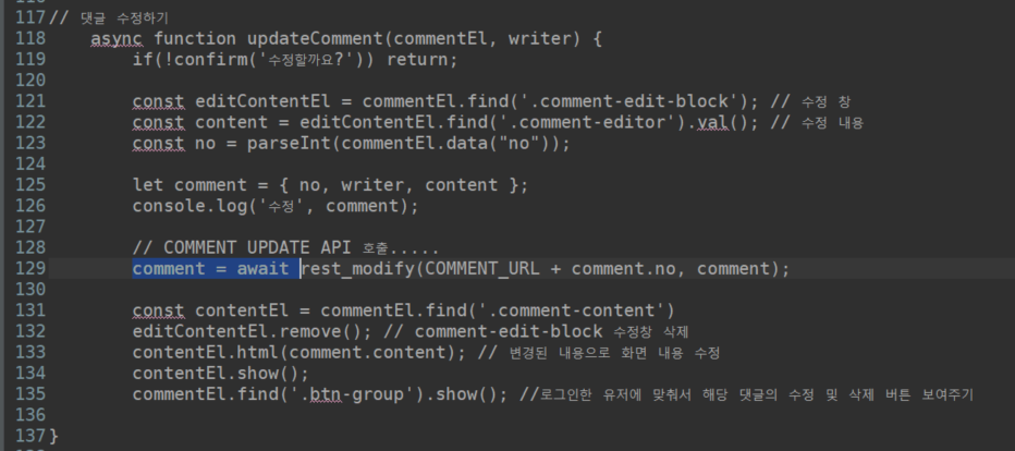 // 댓글 수정하기 async function updateComment(commentEl, writer) { if(!confirm('수정할까요?')) return; const editContentEl = commentEl.find('.comment-edit-block'); // 수정 창 const content = editContentEl.find('.comment-editor').val(); // 수정 내용 const no = parseInt(commentEl.data("no")); let comment = { no, writer, content }; console.log('수정', comment); // COMMENT UPDATE API 호출..... // comment = rest_modify(COMMENT_URL + comment.no, comment); const contentEl = commentEl.find('.comment-content') editContentEl.remove(); // comment-edit-block 수정창 삭제 contentEl.html(comment.content); // 변경된 내용으로 화면 내용 수정 contentEl.show(); commentEl.find('.btn-group').show(); //로그인한 유저에 맞춰서 해당 댓글의 수정 및 삭제 버튼 보여주기 }이제 api 호출해야하니 주석 처리된 메서드 가져오자