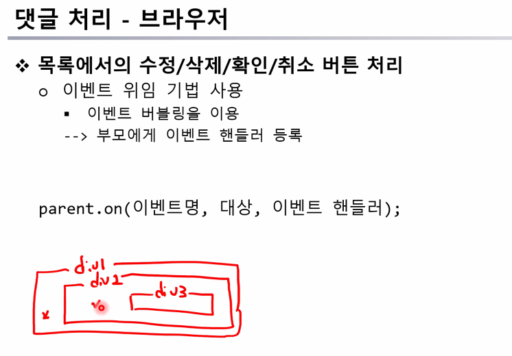 // 댓글 수정, 삭제 버튼 처리 - 이벤트 버블링(이벤트 처리 위임) // 댓글 수정 확인 버튼 클릭 $('.comment-list').on('click', '.comment-update-btn', function (e){ const el = $(this).closest('.comment'); updateComment(el, writer); }); // 수정 취소 버튼 클릭 $('.comment-list').on('click', '.comment-update-cancel-btn', cancelCommentUpdate); });