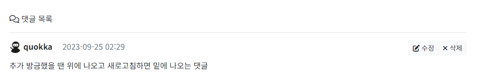 추가 잘 되고 댓글입력칸 클리어 잘 됨 (DB에 등록된 건 아님❗❗ 확인용이라 새로고침하면 사라짐❗)