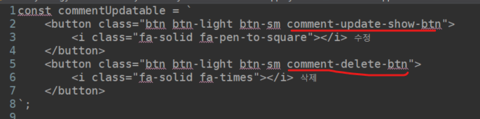 const commentUpdatable = ` <button class="btn btn-light btn-sm comment-update-show-btn"> <i class="fa-solid fa-pen-to-square"></i> 수정 </button> <button class="btn btn-light btn-sm comment-delete-btn"> <i class="fa-solid fa-times"></i> 삭제 </button> `;