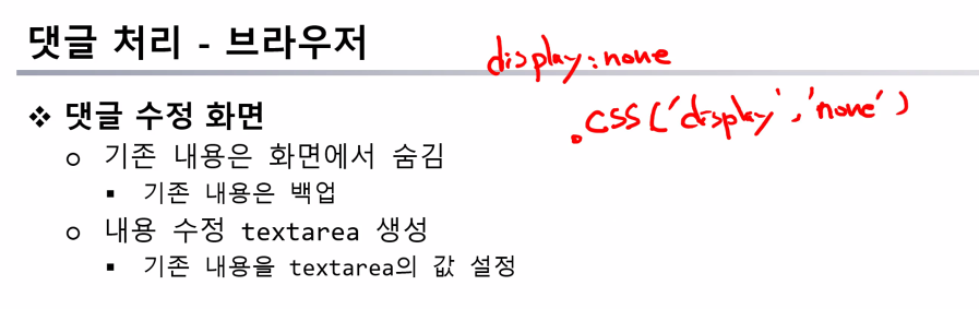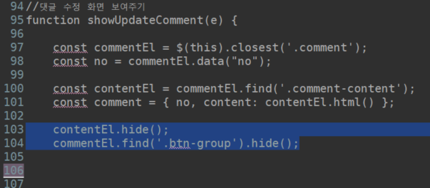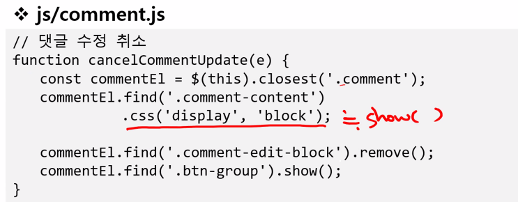 css 스타일은 자주 하니까 show로 해도 된다.(none은 hide) // 댓글 수정 취소 function cancelCommentUpdate(e) { const commentEl = $(this).closest('.comment'); commentEl.find('.comment-content') .show(); //.css('display', 'block'); commentEl.find('.comment-edit-block').remove(); commentEl.find('.btn-group').show(); }
