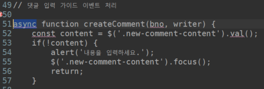 comment.js// 댓글 입력 가이드 이벤트 처리 function createComment(bno, writer) { const content = $('.new-comment-content').val(); if(!content) { alert('내용을 입력하세요.'); $('.new-comment-content').focus(); return; } if(!confirm('댓글을 추가할까요?')) return; let comment = { bno, writer , content } console.log(comment); }