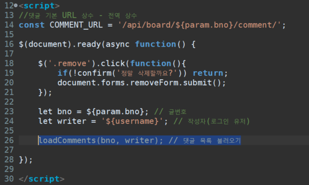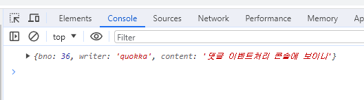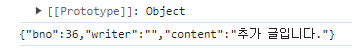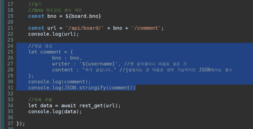 로그인 상태에서 실행하면 댓글이 추가된다.//댓글 생성 let comment = { bno, //key이름과 변수명이 같으면 js에서는 변수명만 써도 key로 등록 writer : '${username}', //얜 문자열이니 따옴표 넣은 것 content : "추가 글입니다." //js에서는 큰 따옴표 생략 가능하지만 JSON에서는 필수.(JSON 작은 따옴표 못 씀) }; console.log(comment); console.log(JSON.stringify(comment)); comment = await rest_create(url, comment); // 생성한 댓글 콘솔로 확인하는 두 줄 console.log(comment);