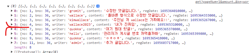async function loadComments(bno, writer) { let comments = []; // API로 불러오기 comments = await rest_get(COMMENT_URL); for(let comment of comments) { const commentEl = createCommentTemplate(comment, writer); $('.comment-list').append($(commentEl)); } }출력화면