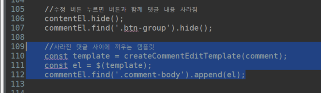 이제 수정버튼 누르면 댓글이 버튼이랑 같이 사라진다.