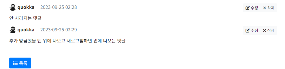 댓글 목록 안에 영역인 comment-list를 이용해야 반응이 일어난다. 기존 목록 + 방금 추가한 수정도 같이 적용된다.