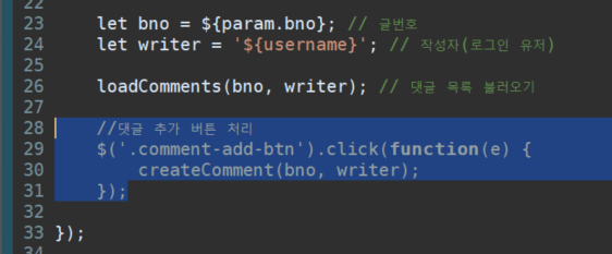 //댓글 추가 버튼 처리 $('.comment-add-btn').click(function(e) { createComment(bno, writer); });