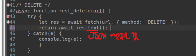 /* DELETE */ async function rest_delete(url) { try { let res = await fetch(url, { method: "DELETE" }); return await res.json(); } catch(e) { console.log(e); } }get.jsp