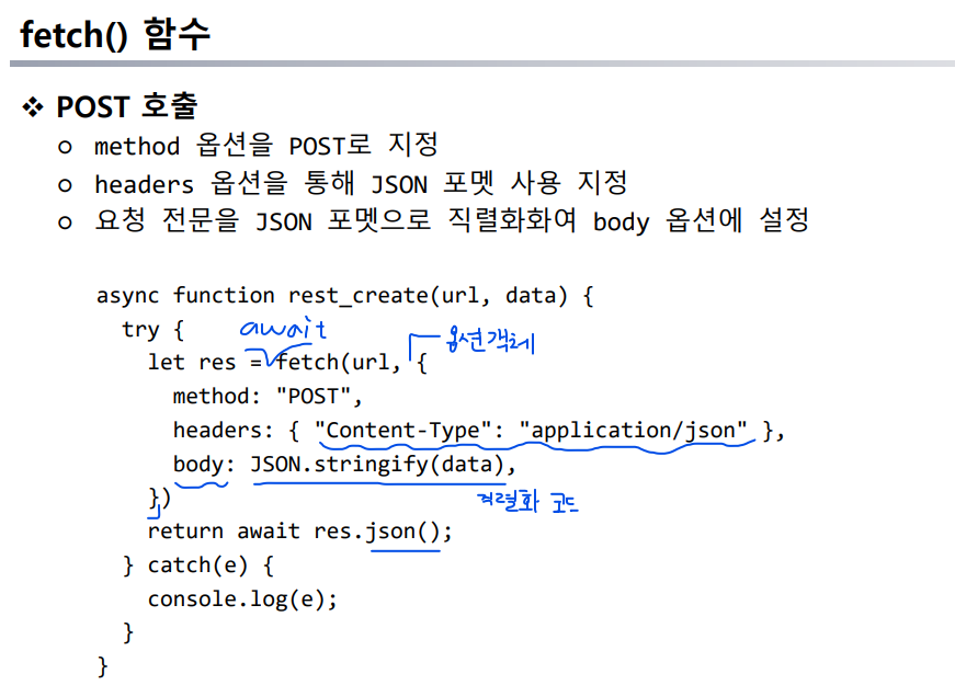 rest.js 에 추가//fetch의 메서드 옵션을 post로 지정 async function rest_create(url, data) { try { let res = await fetch(url, { method: "POST", headers: { "Content-Type": "application/json" }, body: JSON.stringify(data), }) return await res.json(); } catch(e) { console.log(e); } }