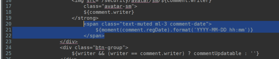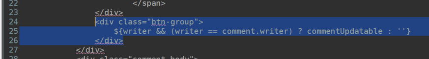 comment.jsfunction createCommentTemplate(comment, writer) { return ` <div class="comment my-3" data-no="${comment.no}" data-writer="${comment.writer}"> <div class="comment-title my-2 d-flex justify-content-between"> <div> <strong class="writer"> <img src="/security/avatar/sm/${comment.writer}" class="avatar-sm"> ${comment.writer} </strong> <span class="text-muted ml-3 comment-date"> ${moment(comment.regDate).format('YYYY-MM-DD hh:mm')} </span> </div> <div class="btn-group"> ${writer && (writer == comment.writer) ? commentUpdatable : ''} </div> </div> <div class="comment-body"> <div class="comment-content">${comment.content}</div> </div> <div class="reply-list ml-5"> <!-- 답글 목록 출력 영역 --> </div> </div> `; }삼항연산자 파트