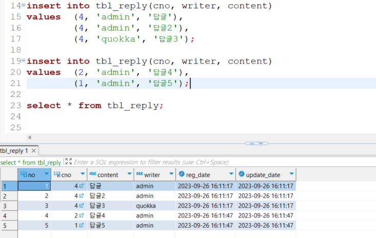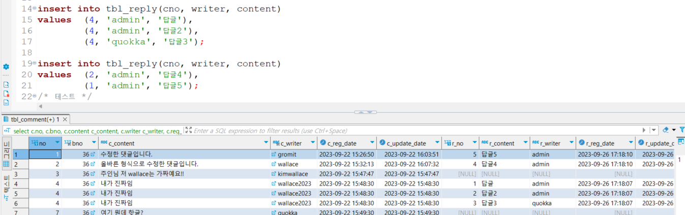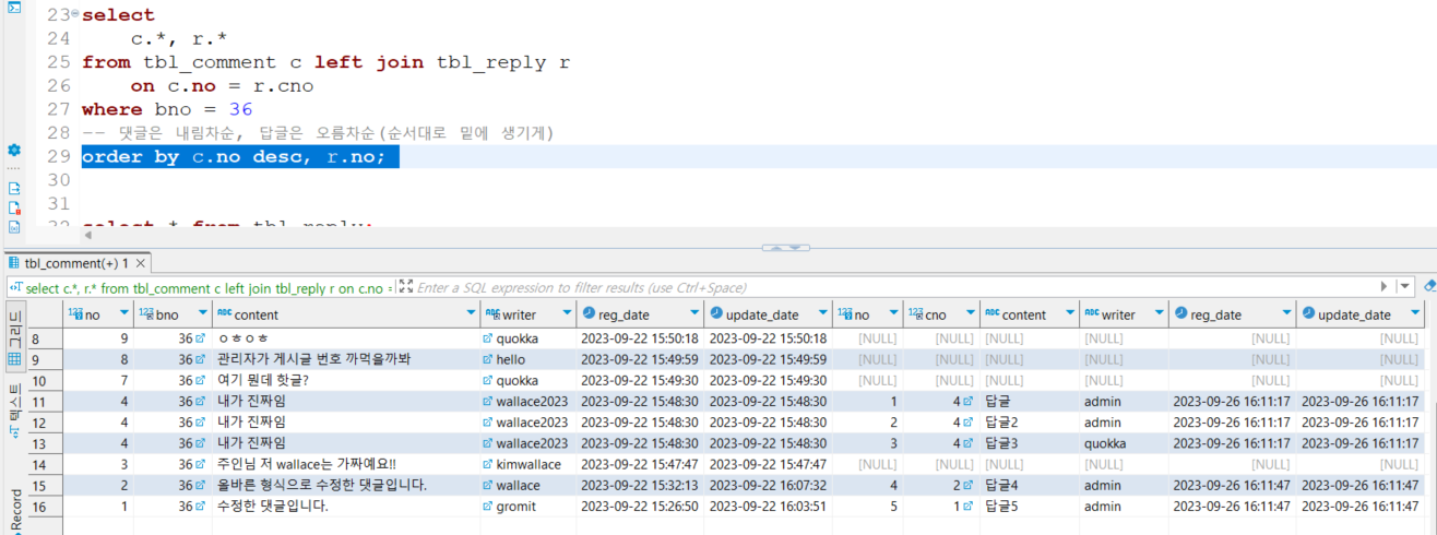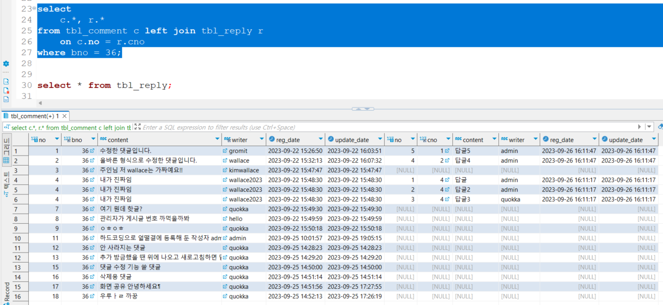 더보기drop table if exists tbl_reply; create table tbl_reply ( no integer auto_increment primary key, cno integer not null, -- comment의 no! foreign key content varchar(1000) not null, writer varchar(50) not null, reg_date datetime default now(), update_date datetime default now(), constraint fk_reply_comment foreign key(cno) references tbl_comment(no) ); insert into tbl_reply(cno, writer, content) values (4, 'admin', '답글'), (4, 'admin', '답글2'), (4, 'quokka', '답글3'); insert into tbl_reply(cno, writer, content) values (2, 'admin', '답글4'), (1, 'admin', '답글5'); /* 테스트 */ select c.*, r.* from tbl_comment c left join tbl_reply r on c.no = r.cno where bno = 36 -- 댓글은 내림차순, 답글은 오름차순(순서대로 밑에 생기게) order by c.no desc, r.no; /* 실제 sql 문 */ select c.no, c.bno, c.content c_content, c.writer c_writer, c.reg_date c_reg_date, c.update_date c_update_date, r.no r_no, r.content r_content, r.writer r_writer, r.reg_date r_reg_date, r.update_date r_update_date from tbl_comment c left join tbl_reply r on c.no = r.cno where bno = 36; select * from tbl_reply;