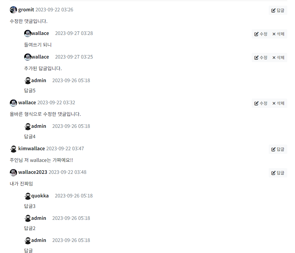 4,5 번 답글 때문에 헷갈릴까봐 어떻게 추가했었는지 같이 캡쳐 (답글 4가 2번 댓글이고 답글 5를 1번 댓글에 등록해서 그렇다) sql문