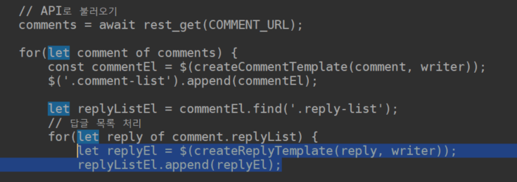 let replyEl = $(createReplyTemplate(reply, writer)); replyListEl.append(replyEl);