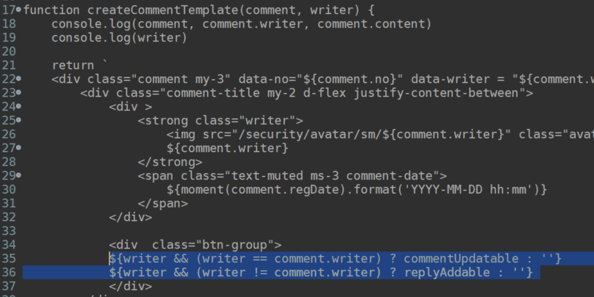 //답글 생성 function createReplyTemplate(reply, writer) { return ` <div class="reply my-3" data-no="${reply.no}" data-writer="${reply.writer}"> <div class="reply-title my-2 d-flex justify-content-between"> <div class="reply-head"> <strong class="reply-writer"> <img src="/security/avatar/sm/${reply.writer}" class="avatar-sm">${reply.writer} </strong> <span class="text-muted ml-3 reply-date"> ${moment(reply.regDate).format('YYYY-MM-DD hh:mm')} </span> </div> <div class="btn-group"> ${writer && (writer == reply.writer) ? replyUpdatable : ''} </div> </div> <div class="reply-body"> <div class="reply-content">${ reply.content || '' }</div> </div> </div> `; }