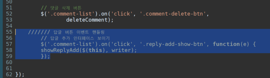 // 답글 삭제 $('.comment-list').on('click', '.reply-delete-btn', deleteReply);