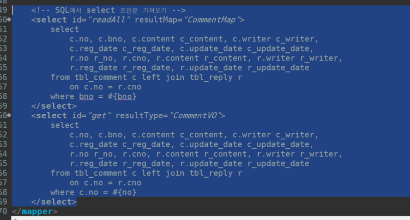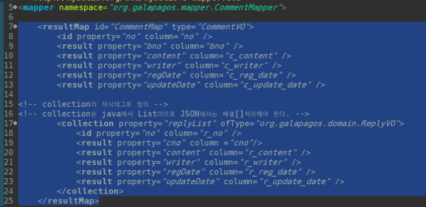 더보기<?xml version="1.0" encoding="UTF-8"?> <!DOCTYPE mapper PUBLIC "-//mybatis.org//DTD Mapper 3.0//EN" "http://mybatis.org/dtd/mybatis-3-mapper.dtd"> <mapper namespace="org.galapagos.mapper.CommentMapper"> <resultMap id="CommentMap" type="CommentVO"> <id property="no" column="no" /> <result property="bno" column="bno" /> <result property="content" column="c_content" /> <result property="writer" column="c_writer" /> <result property="regDate" column="c_reg_date" /> <result property="updateDate" column="c_update_date" /> <!-- collection의 자식태그로 정의 --> <!-- collection은 java에서 List이므로 JSON에서는 배열[]처리해야 한다. --> <collection property="replyList" ofType="org.galapagos.domain.ReplyVO"> <id property="no" column="r_no" /> <result property="cno" column ="cno"/> <result property="content" column="r_content" /> <result property="writer" column="r_writer" /> <result property="regDate" column="r_reg_date" /> <result property="updateDate" column="r_update_date" /> </collection> </resultMap> <insert id="create"> insert into tbl_comment (bno, writer, content) values(#{bno}, #{writer}, #{content}) <!-- insert로 인해 property랑 column에 auto_increment 된 값이 무엇인지 확인용 --> <selectKey resultType="Long" keyProperty="no" keyColumn="no" order="AFTER"> SELECT LAST_INSERT_ID() </selectKey> </insert> <update id="update"> update tbl_comment set content = #{content}, update_date = now() where no = #{no} </update> <delete id="delete"> delete from tbl_comment where no = #{no} </delete> <!-- SQL에서 select 조인문 가져오기 --> <select id="readAll" resultMap="CommentMap"> select c.no, c.bno, c.content c_content, c.writer c_writer, c.reg_date c_reg_date, c.update_date c_update_date, r.no r_no, r.cno, r.content r_content, r.writer r_writer, r.reg_date r_reg_date, r.update_date r_update_date from tbl_comment c left join tbl_reply r on c.no = r.cno where bno = #{bno} </select> <select id="get" resultType="CommentVO"> select c.no, c.bno, c.content c_content, c.writer c_writer, c.reg_date c_reg_date, c.update_date c_update_date, r.no r_no, r.cno, r.content r_content, r.writer r_writer, r.reg_date r_reg_date, r.update_date r_update_date from tbl_comment c left join tbl_reply r on c.no = r.cno where c.no = #{no} </select> </mapper>talend로 가서 테스트 해 보기