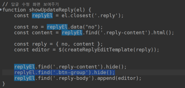 // 답글 수정 화면 취소 function cancelReplyUpdate() { const replyEl = $(this).closest('.reply'); replyEl.find('.reply-content').show(); //취소니까 원래 화면 복원한 것 replyEl.find('.reply-edit-block').remove(); }get.jsp