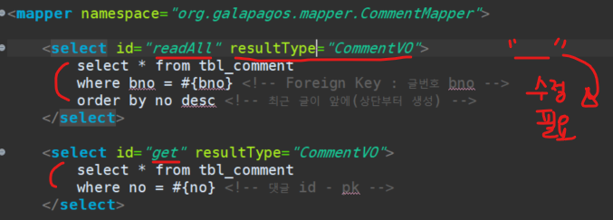 package org.galapagos.mapper; import org.galapagos.domain.ReplyVO; public interface ReplyMapper { ReplyVO get(Long no); void create(ReplyVO vo); void update(ReplyVO vo); void delete(Long no); }4. ReplyMapper.xml