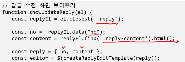 // 답글 수정 화면 보여주기 function showUpdateReply(el) { const replyEl = el.closest('.reply'); const no = replyEl.data("no"); const content = replyEl.find('.reply-content').html(); const reply = { no, content }; const editor = $(createReplyEditTemplate(reply)); replyEl.find('.reply-content').hide(); replyEl.find('.reply-body').append(editor); }답글 수정한 화면 이벤트 핸들링