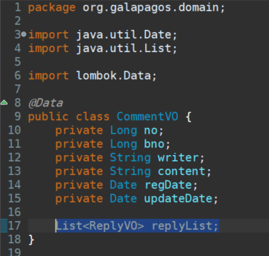 => 여러 개의 답글을 한 댓글이 담아야 하니, CommentVO에 property가 List<ReplyVO>로 추가되어야 한다.
