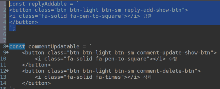 //답글 버튼 관리 const replyUpdatable = ` <button class="btn btn-light btn-sm reply-update-show-btn"> <i class="fa-solid fa-pen-to-square"></i> 수정 </button> <button class="btn btn-light btn-sm reply-delete-btn"> <i class="fa-solid fa-times"></i> 삭제 </button> `;