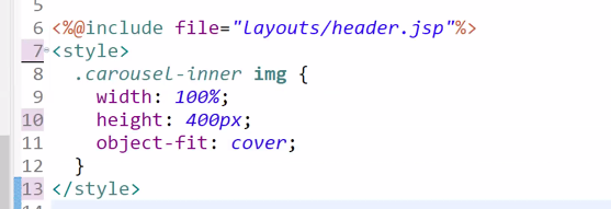 <style> .carousel-inner img{ width: 100%; height: 400px; object-fit: cover; <!--가로세로 왜곡 보정--> } </style>
