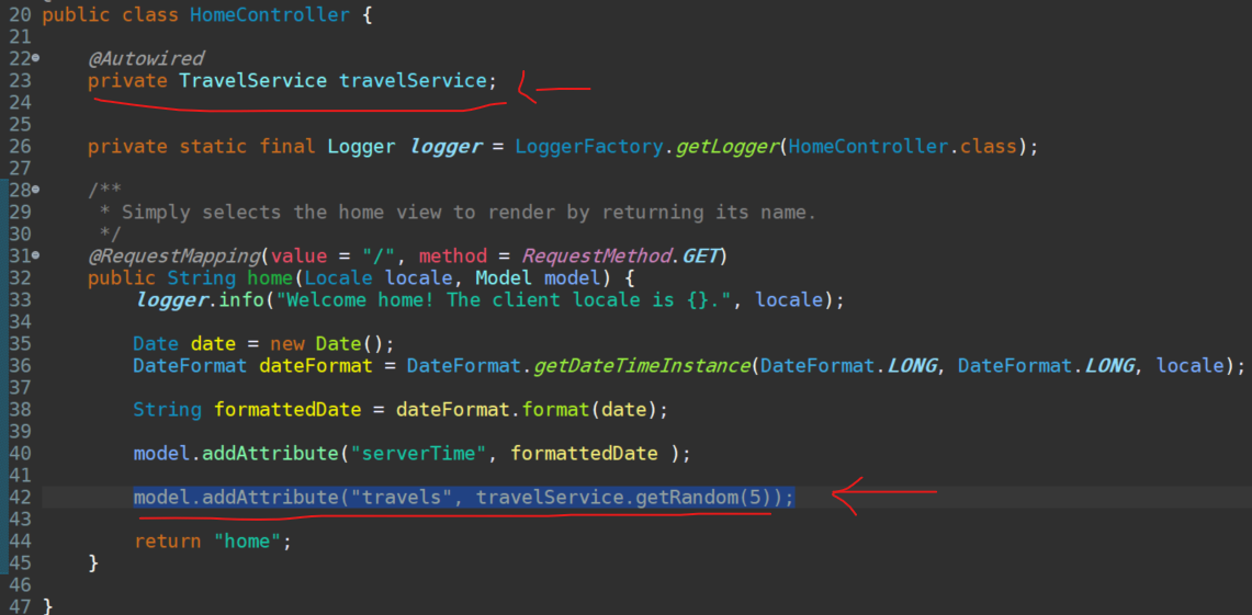 package org.galapagos.controller; import java.text.DateFormat; import java.util.Date; import java.util.Locale; import org.galapagos.service.TravelService; import org.slf4j.Logger; import org.slf4j.LoggerFactory; import org.springframework.beans.factory.annotation.Autowired; import org.springframework.stereotype.Controller; import org.springframework.ui.Model; import org.springframework.web.bind.annotation.RequestMapping; import org.springframework.web.bind.annotation.RequestMethod; /** * Handles requests for the application home page. */ @Controller public class HomeController { @Autowired private TravelService travelService; private static final Logger logger = LoggerFactory.getLogger(HomeController.class); /** * Simply selects the home view to render by returning its name. */ @RequestMapping(value = "/", method = RequestMethod.GET) public String home(Locale locale, Model model) { logger.info("Welcome home! The client locale is {}.", locale); Date date = new Date(); DateFormat dateFormat = DateFormat.getDateTimeInstance(DateFormat.LONG, DateFormat.LONG, locale); String formattedDate = dateFormat.format(date); model.addAttribute("serverTime", formattedDate ); model.addAttribute("travels", travelService.getRandom(5)); return "home"; } }임의의 위치로 갈 수 있는 indicator, 화살표 등 만들기