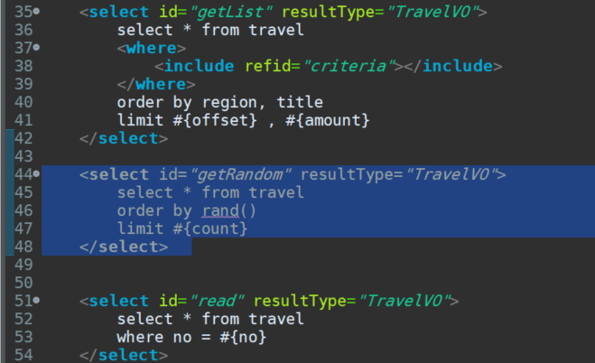 <select id="getRandom" resultType="TravelVO"> select * from travel order by rand() limit #{count} </select>