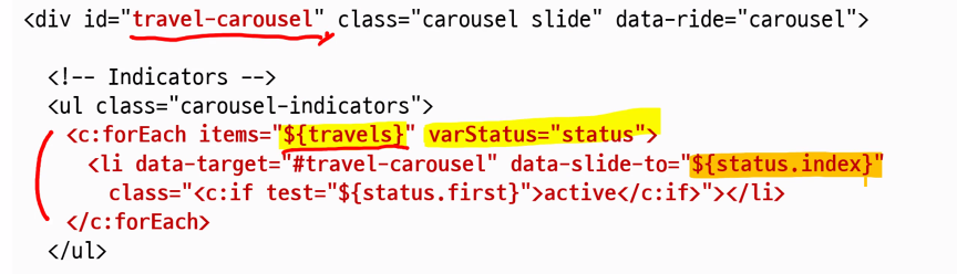 루프는 컬렉션만큼 돌지만 travel 자체는 필요하지 않으므로 foreach를 돌 땐 varStatus(반복문 상태에 대한 참조변수)를 사용한다.